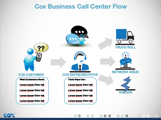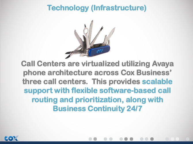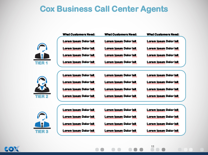The lead engineer at Cox called me in to develop a program to unite his engineers, three levels of tech support and call centers across the country. We built twelve 30-minute training modules designed to be delivered as online seminars via Cox intranet. Here are a few of the hundreds of slides we made. The tech support team has a 4-star rating now that we pulled their team together to all speak the same language.